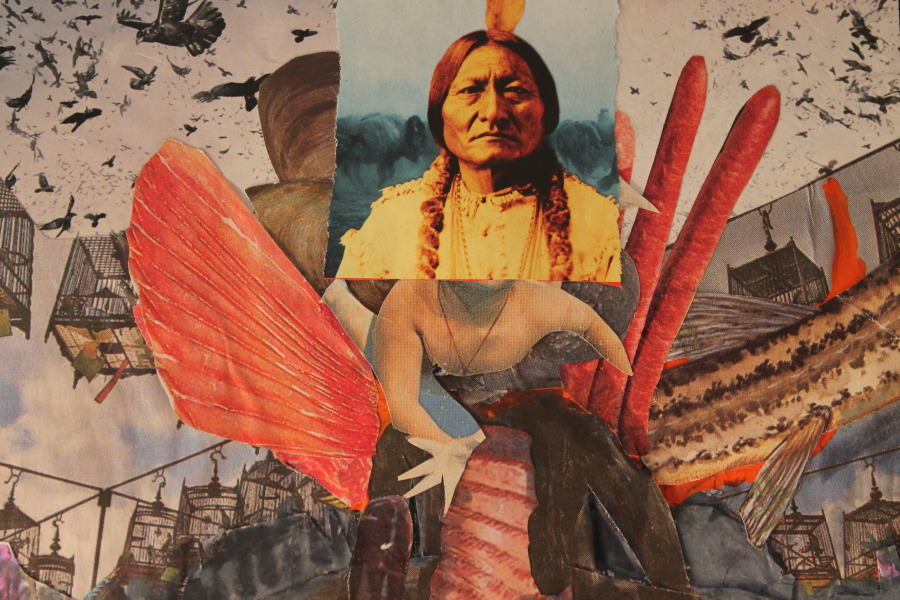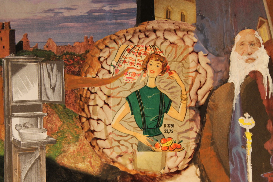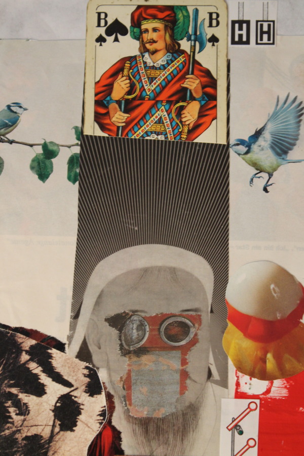 Ich habe meist schon eine Ahnung, wozu sie dienen könnten. Letzten Endes entscheidet sich das am Tisch. Wenn das Bild wird. Ich lasse mich auf das Bild ein. Wie sich Elemente aufeinander beziehen. (Manches wird dann auch zur dekorativen Randerscheinung). Kriterien sind: wie harmonieren Bildinhalte? Wie bilden sie einen möglichst starken Widerspruch? Ich habe bemerkt, dass die Entscheidung aus einem Bereich meines Körpers stammt, die sich in Höhe meiner Ohren abspielt. Als würde ich weniger denken als hören. Obwohl ich sehe. So fühle ich.
